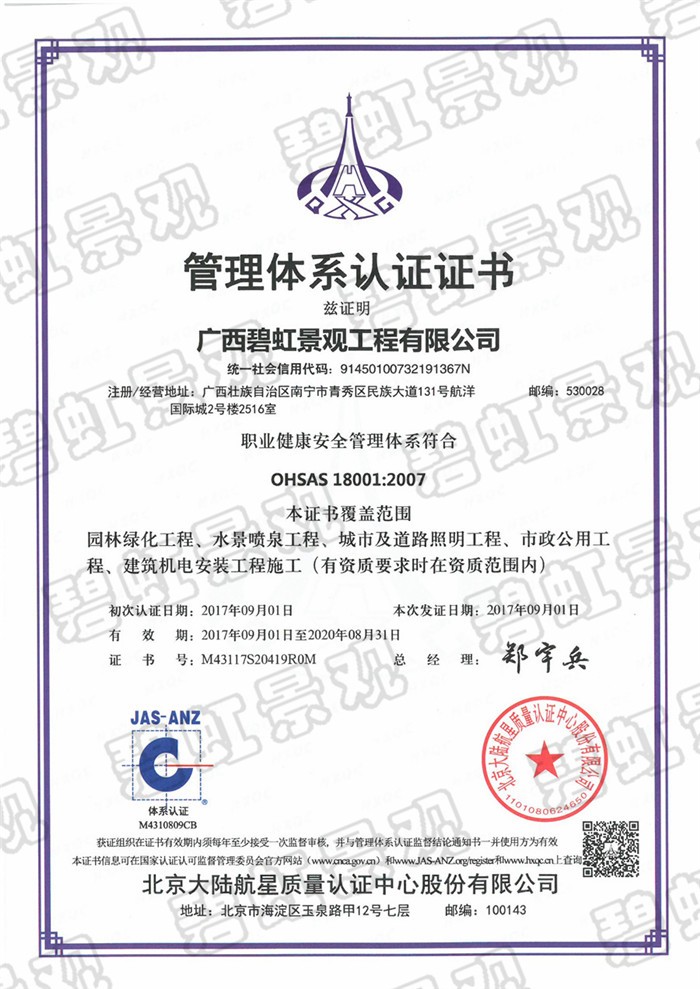 職業(yè)健康安全管理體系認證證書